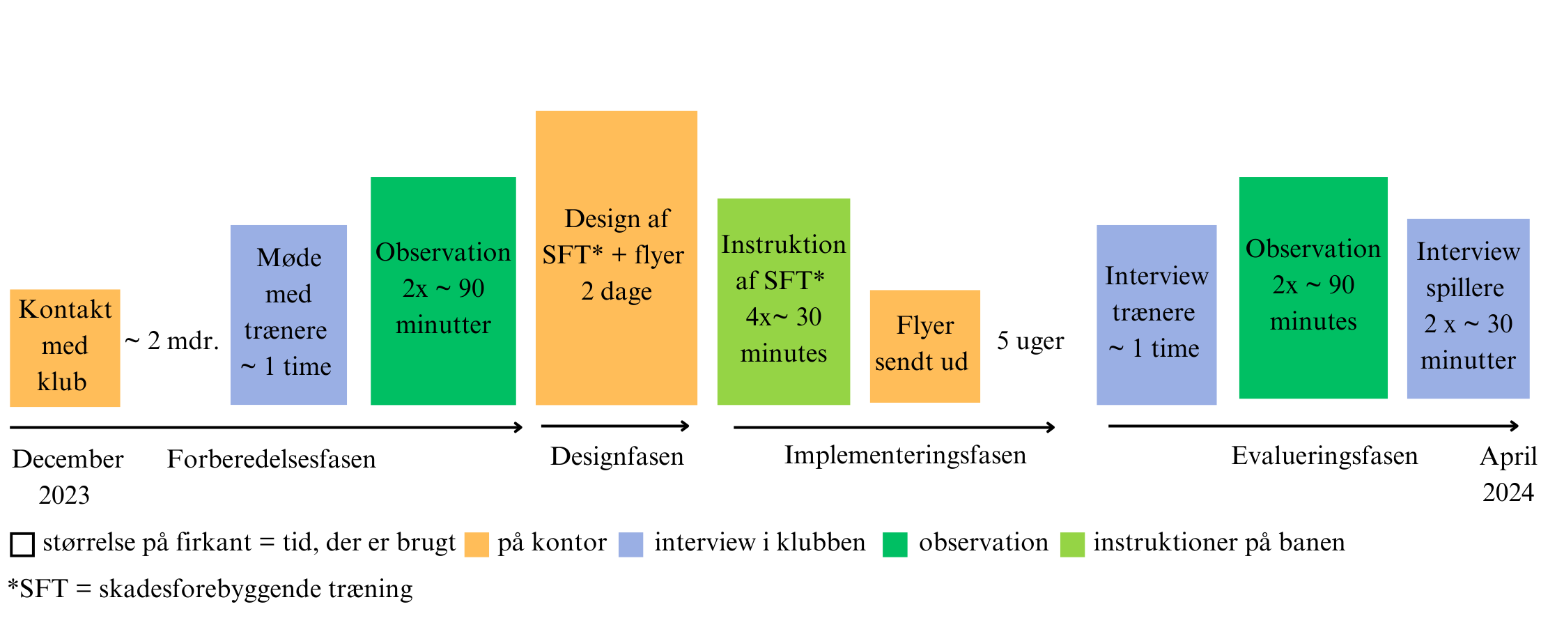 Metoden for dette projekt tager udgangspunkt i Paduas teoretiske ramme for udvikling og implementering af skadesforebyggende træning (18). Denne ramme indeholder syv trin, som overordnet kan opdeles i fire faser: forberedelse, design, implementering og evaluering. Tidslinjen for implementeringsprocessen fremgår af figur 1.