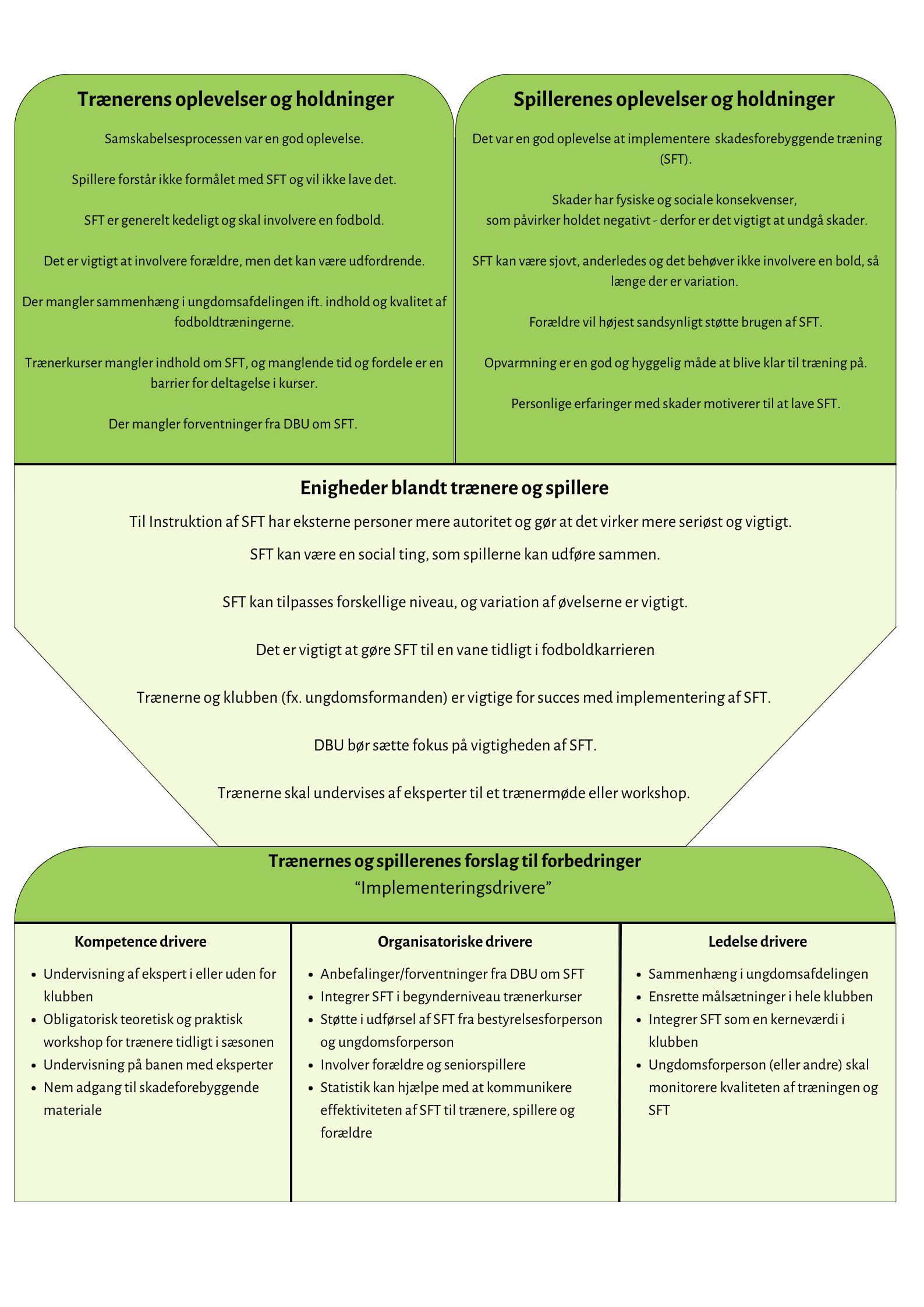- Ansvar og involvering af aktører: Trænerne følte ansvar for SFT, men ønskede også, at klubben, DBU, forældre og rollemodeller skulle bidrage.