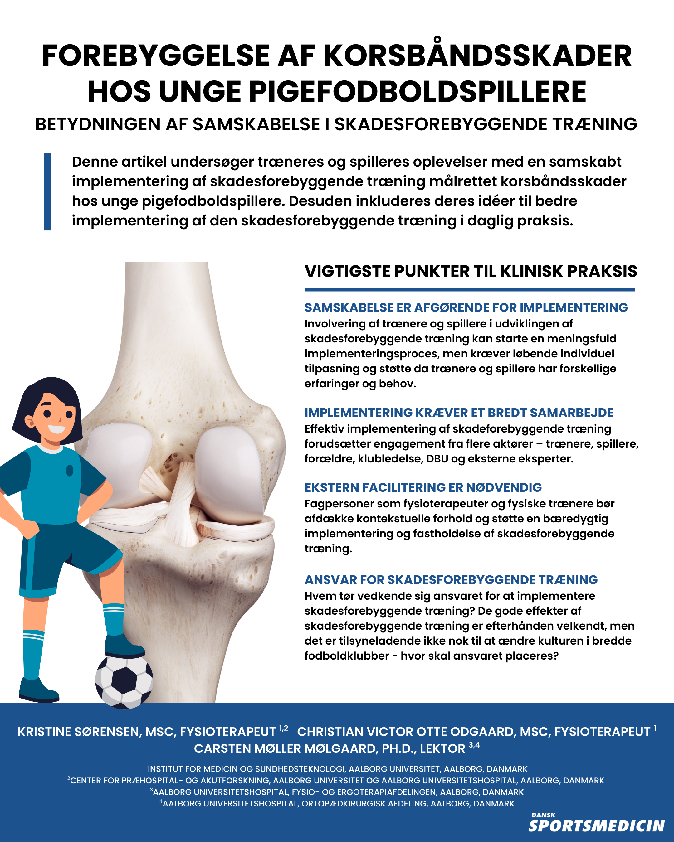 Forskning har påvist, at fysisk aktivitet kan anvendes til at forebygge og behandle en lang række sygdomme samt forbedre den generelle sundhed hos den enkelte (1,2). I Danmark er fodbold den mest populære form for struktureret og konkurrencepræget fysisk aktivitet (3). På trods af de gavnlige effekter og glæden ved at spille fodbold, er det ikke uden risiko at dyrke sporten. Unge piger er særligt udsatte for skader på det forreste korsbånd, som kan have alvorlige konsekvenser både for den enkelte spiller og for samfundet (4–6). For den enkelte kan en forreste korsbåndsskade medføre negative psykologiske konsekvenser, øget risiko for knæartrose samt en forhøjet risiko for gentagne korsbåndsskader (7–11). For samfundet kan skaderne medføre betydelige økonomiske omkostninger, særligt i tilfælde hvor de rammer unge (12). Risikoen for forreste korsbåndsskader kan reduceres gennem skadesforebyggende træning (SFT) (13), men på trods af veldokumenterede positive effekter bliver sådanne programmer ikke implementeret i tilstrækkelig grad i praksis (14,15). For at overvinde implementeringsbarrierer er det essentielt at involvere brugerne og udnytte deres kontekstspecifikke viden og erfaring (16). Én metode til at opnå dette er samskabelse (co-creation), der har til formål at engagere relevante aktører i alle faser af udvikling og implementering (17).