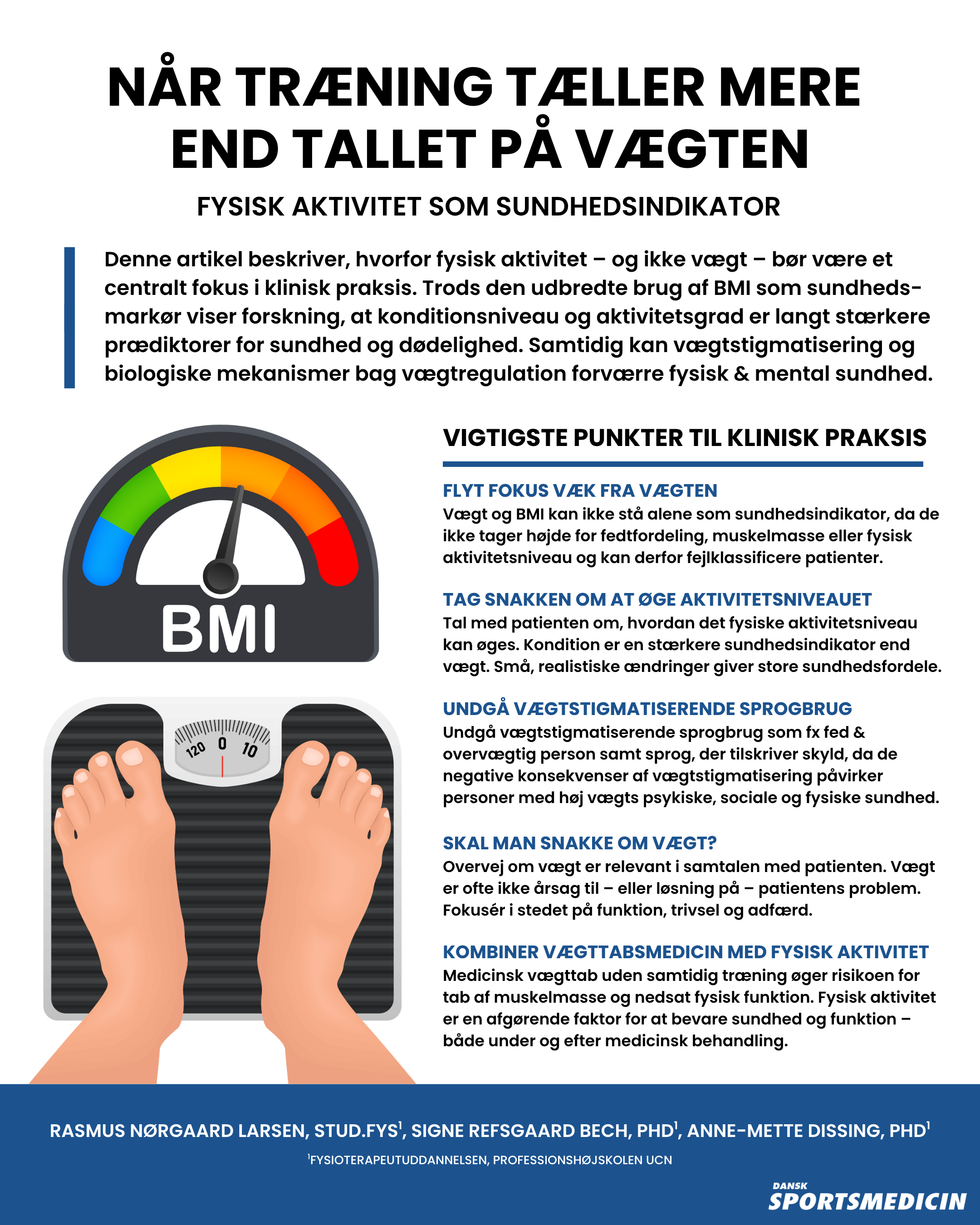 Høj vægt er ofte forbundet med udviklingen af en række sygdomme, herunder artrose, visse former for kræft, type 2-diabetes og hjerte-kar-sygdomme. BMI bruges til at vurdere, om vægten er høj, men målet har væsentlige begrænsninger, idet det ikke skelner mellem fedtfordeling, muskelmasse eller fysisk aktivitetsniveau (3,4). Koblingen mellem høj vægt og de nævnte sygdomme hænger sammen med, at især visceralt fedt kan føre til systemisk inflammation og oxidativt stress (5,6). Det samme gør sig dog gældende ved fysisk inaktivitet (7) og vægtstigmatisering (2), hvorfor et ensidigt fokus på vægttab er uhensigtsmæssigt. Samtidig viser evidens, at sult- og mæthedsregulerende hormoner ikke tilpasses vægttabet, hvilket er en af flere faktorer, der gør det vanskeligt for mange at vedligeholde et vægttab (8). Derudover viser studier, at lav kondition er en stærkere prædiktor for dødelighed end høj vægt (9), og at fysisk aktivitet reducerer systemisk inflammation og forbedrer sundhedsmarkører uafhængigt af vægttab (6,10). I denne artikel beskriver vi derfor, hvorfor vi anbefaler at skifte til en vægtinkluderende og aktivitetsfokuseret tilgang i klinisk praksis.